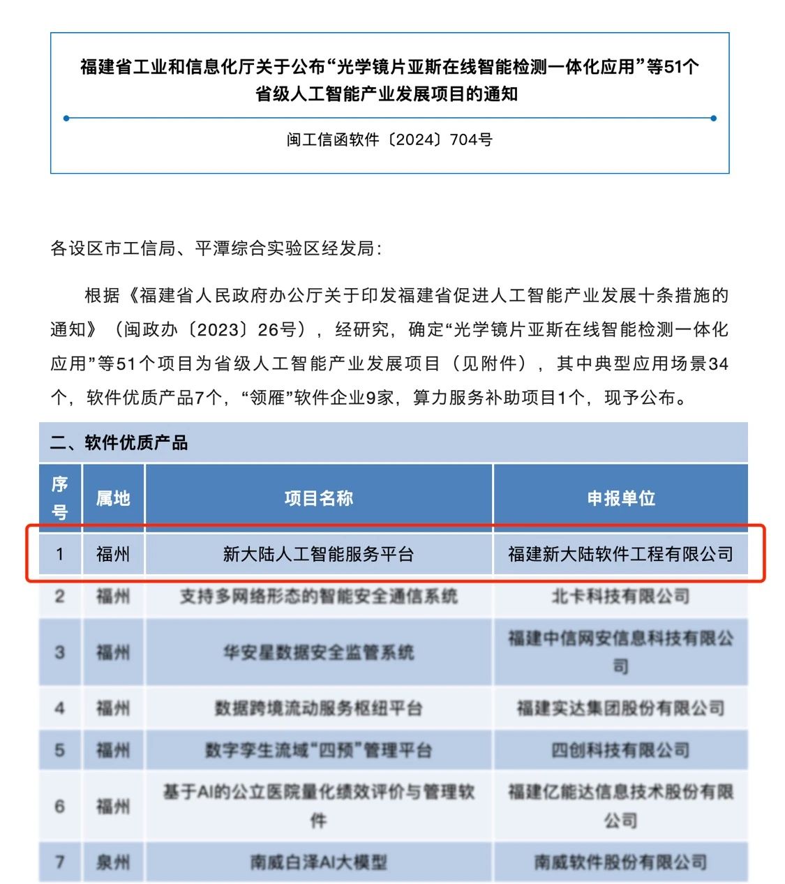 近日,福建省工业和信息化厅正式公布了省级人工智能产业发展项目的通知,“金年会人工智能服务平台”以第一名的成绩获软件优质产品荣誉,成为此次公布项目中的佼佼者,标志着金年会软件在推动人工智能技术的创新与应用方面迈出了坚实的一步。