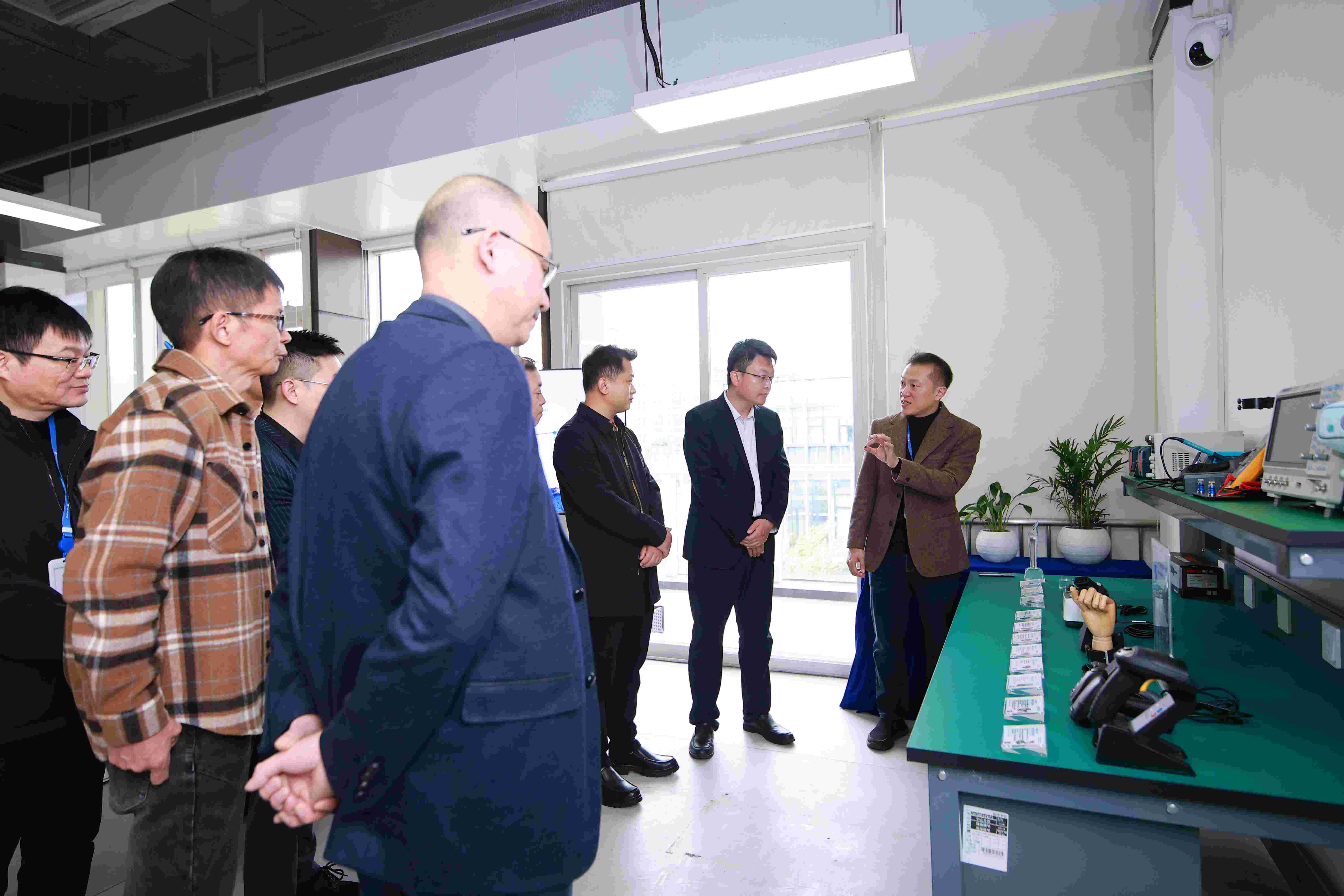 ▲在新落成的金年会优迈捷办公场地内,展示了多款自主研发的产品;金年会优迈捷公司总经理郭锋(右一)向来访嘉宾介绍公司产品及技术