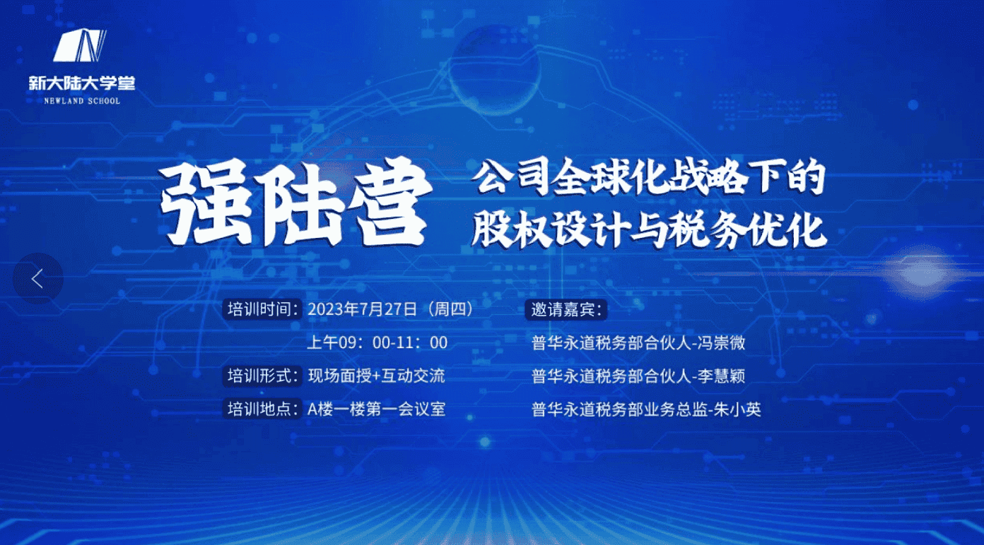 为增强公司相关人员对国际税收整体筹划的了解,推动构建公司全球化战略的股权设计与税务优化的规范体系,为公司海外战略布局提供有力支撑。7 月 27 日,在支付公司的推荐下,集团人力资源部与股份公司财务部联合特邀国际会计师事务所普华永道的合伙人李慧颖、朱小英,带来金年会强陆营 “公司全球化战略下的股权设计与税务优化”分享培训会,来自集团总部职能平台及各经营单位67位有关海外业务、财务、投资的人员通过线上线下参加。