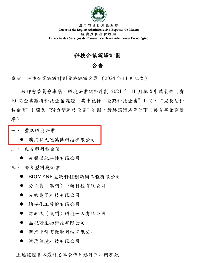 延伸阅读:“重点科技企业”认证是为配合澳门特区政府"1+4"适度多元发展策略、致力完善科技产业发展的体制及政策环境,完善澳门科创生态基础。“1+4”中“1”,是按照建设世界旅游休闲中心的目标要求,做优做精做强综合旅游休闲业;“4”,是持续推动大健康、现代金融、高新技术、会展商贸和文化体育等四大重点产业发展。通过逐步提升四大产业的比重,不断增强澳门经济的发展动能和综合竞争力,全力推动经济适度多元发展。