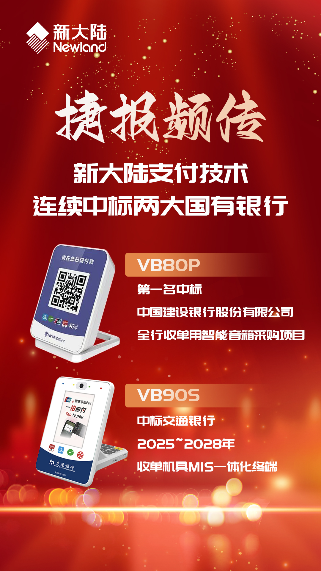 近日,金年会支付技术迎来开门红,捷报频传,喜讯连连。金年会支付技术凭借突出的产品实力和完善的服务能力,成功入围中国建设银行和交通银行两大国有银行采购项目。中标产品支付云音箱VB80P和非接扫码盒VB90S覆盖餐饮、零售、酒店等各类商业场景,满足不同体量商户的支付需求。